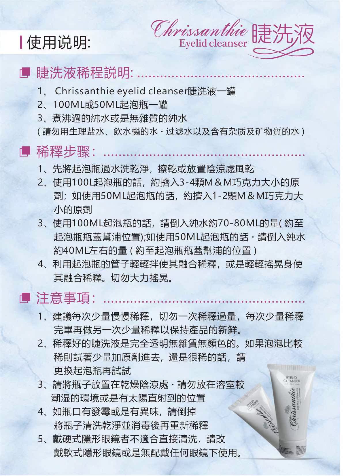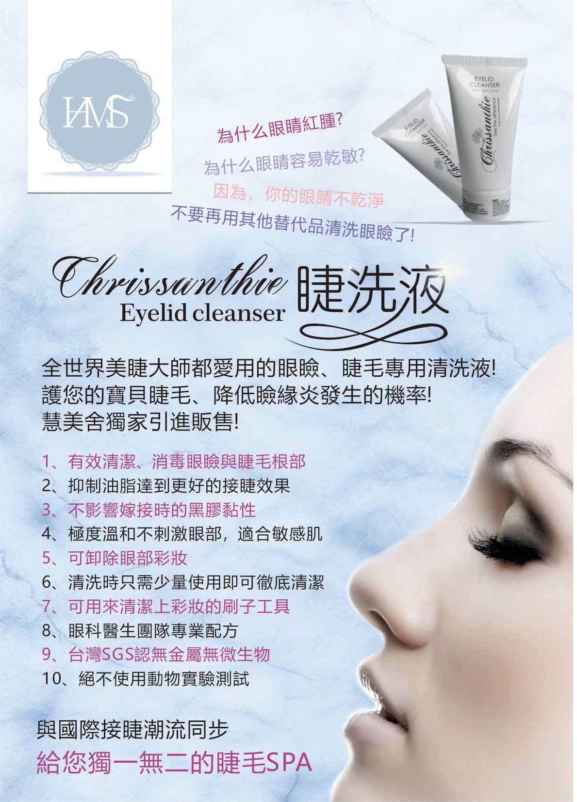 由著名眼科醫生Chrissie Cockinos博士設計的革命性眼瞼和睫毛延伸清潔劑 Chrissanthie眼瞼清潔劑是一種獨特的清潔配方,它不僅能有效地去除眼部的妝容(即使是防水睫毛膏),還能幫助清除眼瞼上因眼瞼發炎而產生的分泌物或結痂的產生的症狀。是一款革命性的眼瞼清洗露 適合睫毛延長使用的全合一潔面乳 Chrissanthie眼瞼潔面乳是用即方便又有效的方法來溫和的清潔和修整脆弱的眼瞼和睫毛。 Chrissanthie眼瞼清潔劑溫和配方,可用於日常卸妝和睫毛清潔劑。 Chrissanthie眼瞼清潔劑能徹底清潔和清潔眼瞼和卸妝。其溫和的配方,確保不會打破用於睫毛延長的粘合劑。 包含茶樹和柑橘提取物,可以徹底潔淨和清潔眼瞼 去除所有眼妝的痕跡,長期使用的產品也不會損壞睫毛延長用的黏合劑,也非常適用於清潔化妝刷和工具 適用於敏感肌膚及隱形眼鏡配戴者,令眼睛感覺清涼及舒緩,無任何油性殘留物